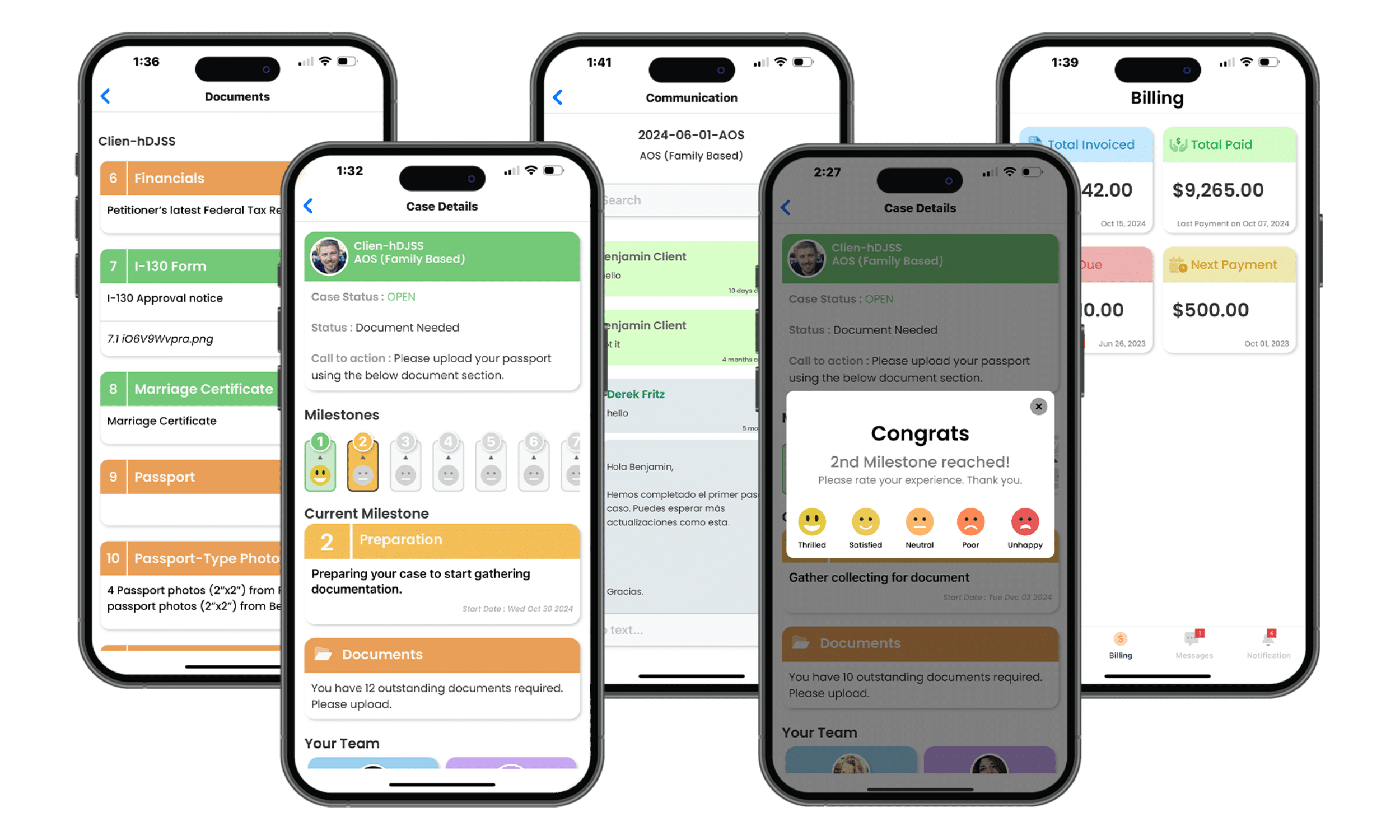 The CampLegal Client App is designed to make communication with your clients seamless, efficient, and personalized. By offering real-time updates, automated notifications, and easy document uploads, the app streamlines case management for your clients while reducing the workload on your staff. With multilingual support and a user-friendly interface, CampLegal provides the tools to keep clients informed, engaged, and satisfied throughout their case journey.