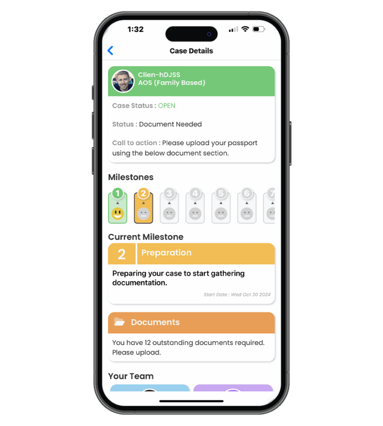 The app provides three types of notifications—Milestones, Case Updates, and Texts—ensuring clients are always informed. Custom milestones, case status updates, and Call-to-Actions make it clear what’s next in their case. Automated workflows mean your team spends less time sending updates, and your clients get more transparency.