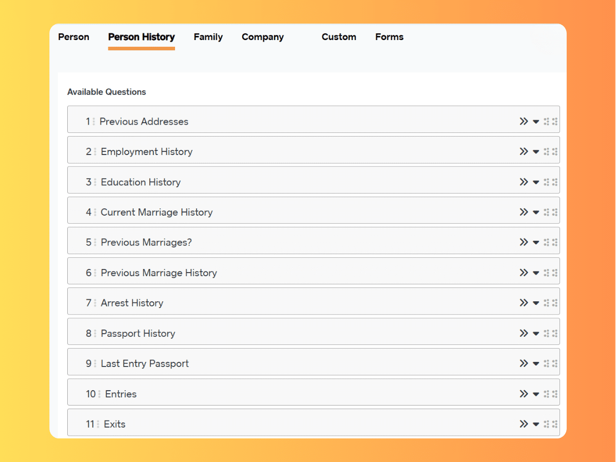 Ask the right questions based on each client's situation. If they answer "Yes" to having prior arrests, the system automatically asks for arrest history details. If "No," it skips ahead. No other immigration case management system offers this level of intelligence.