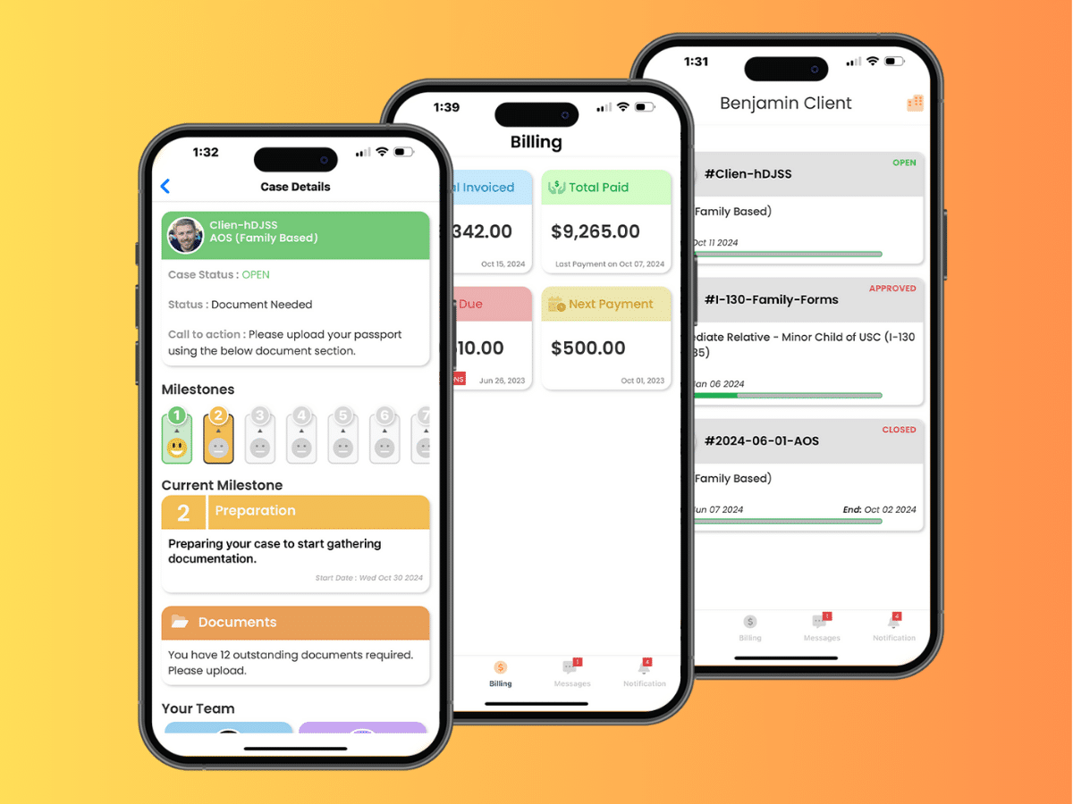 When clients add their spouse or children, the system automatically creates their profiles and links relationships. This data flows directly into I-130s, I-485s, and all family-based forms. No re-entering information.
